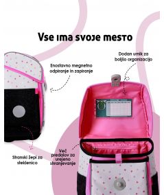Več predalov omogoča lažje razporejanje stvari. Knjige in zvezki imajo svoje mesto. Otrok hitreje najde, kar potrebuje. Torba ostane pregledna.