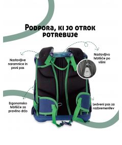 Šolski nahrbtnik za osnovnošolce, ki potrebujejo udobje in pravilno oporo. Ergonomsko hrbtišče pomaga pri drži, nastavljivo hrbtišče pa se prilagodi rasti. Primeren je za vsak dan v šoli. V setu dobite vse, kar otrok potrebuje.